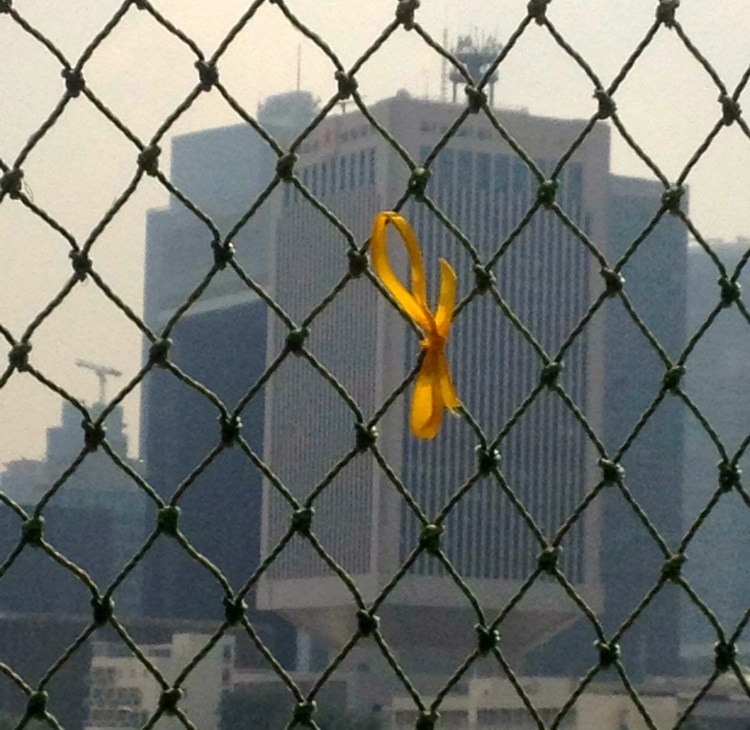 The yellow ribbon has become a symbol of the movement, commonly referred to as the ‘Umbrella Revolution’. This ribbon is photographed in front of the People’s Liberation Army Forces Building.