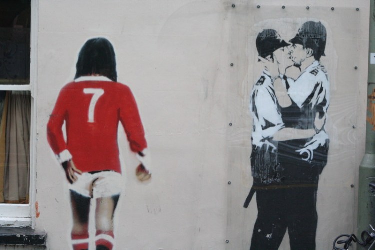 The act of making street art itself is read as a tool against elitism, making the artworks accessible to everyone. Many see the art world as snobbish because most galleries and museum charge a great sum for entry (unlike most British institutions), and often the exhibited works require a certain level of education in art history. However, street art located in public places does not require money, and often artists put up pictures of their works onto the internet. Furthermore, most of these works use direct visual imagery with clear meanings, so their interpretation does not require a high level of education. These features make street art an excellent form to propagate human rights. Unlike commissioned public art, street art is illicit and many find it subversive, thus most street artists are forced to use pseudonyms to avoid legal prosecution for vandalism. Banksy, arguably the most famous street artist, keeps his identity a secret. His work focuses on the process of intervention and public engagement, and he travels across the world to stimulate political dialogue on social struggle by making site-specific, temporary art. He has made works related to, inter alia, LGBT+ rights, oppression of marginalised groups, workers’ rights, government surveillance, and, recently, the refugee crisis.