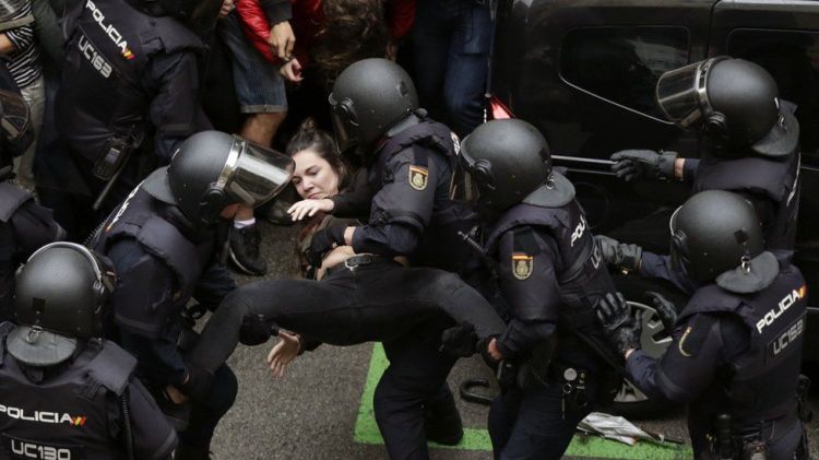 Officers were seen stamping and kicking protesters as they stormed buildings and seized ballot boxes in Barcelona. Source: BBC