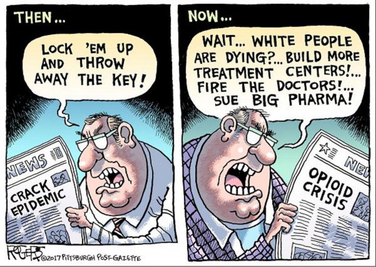 The black community in the US has long struggled with opioid addiction, which politicians and media have used to demonize them. Ronald Reagan’s “War on Drugs”, which began in the 1980s and had ramifications through the 1990s to present day, put hundreds of thousands of black people in prison. As part of the War on Drugs, there were mandatory minimum sentencing for drug possession, even in trace amounts, and it disproportionally targeted black people. Today, every 25 seconds, an American is arrested for possessing drugs for their personal use. African Americans are imprisoned for drug charges at six times that of whites, despite similar drug usage rates between the two groups. Through this campaign, black addiction to drugs was deemed a problem with the black community specifically, rather than a problem spanning across all races. It was an epidemic and a human rights issue in the 1980s and 1990s, but was not treated like one. Instead, it was made into an innate failing of the black population.